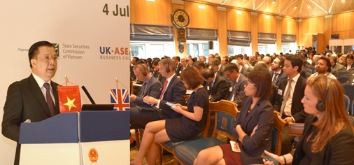 Bộ trưởng Bộ Tài chính Đinh Tiến Dũng phát biểu tại Hội nghị Xúc tiến đầu tư, tổ chức ngày 4/7/2019 tại Thủ đô London, Vương Quốc Anh.