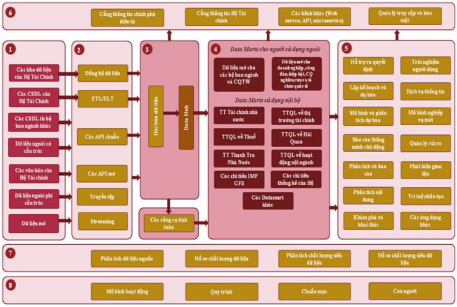 Mô hình kiến trúc tổng thể của Cơ sở dữ liệu quốc gia về Tài chính bao gồm các lớp thực hiện các chức năng từ việc cung cấp dữ liệu nguồn, tích hợp, thu nhận, chuẩn hóa, lưu trữ, phân tích, trực quan hóa dữ liệu tổng hợp từ các nguồn, đến việc phân phối sử dụng dữ liệu một cách hiệu quả, an toàn, kiểm soát chất lượng và thống nhất của dữ liệu.